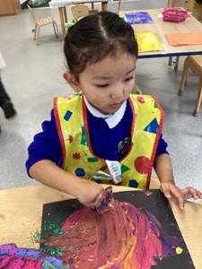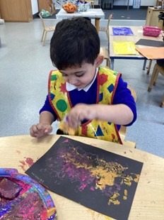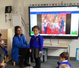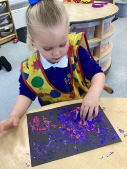 Here we are talking to our friends about fireworks. Some of the Little Birds told their friends about Diwali explaining to the whole class, speaking about the world in which they live. Little Birds made firework patterns using paint.