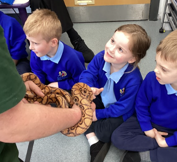They were then introduced to the snake. We were able to stroke the Boa Constrictor and felt his scales. The instructor told us that they only eat once a month!
